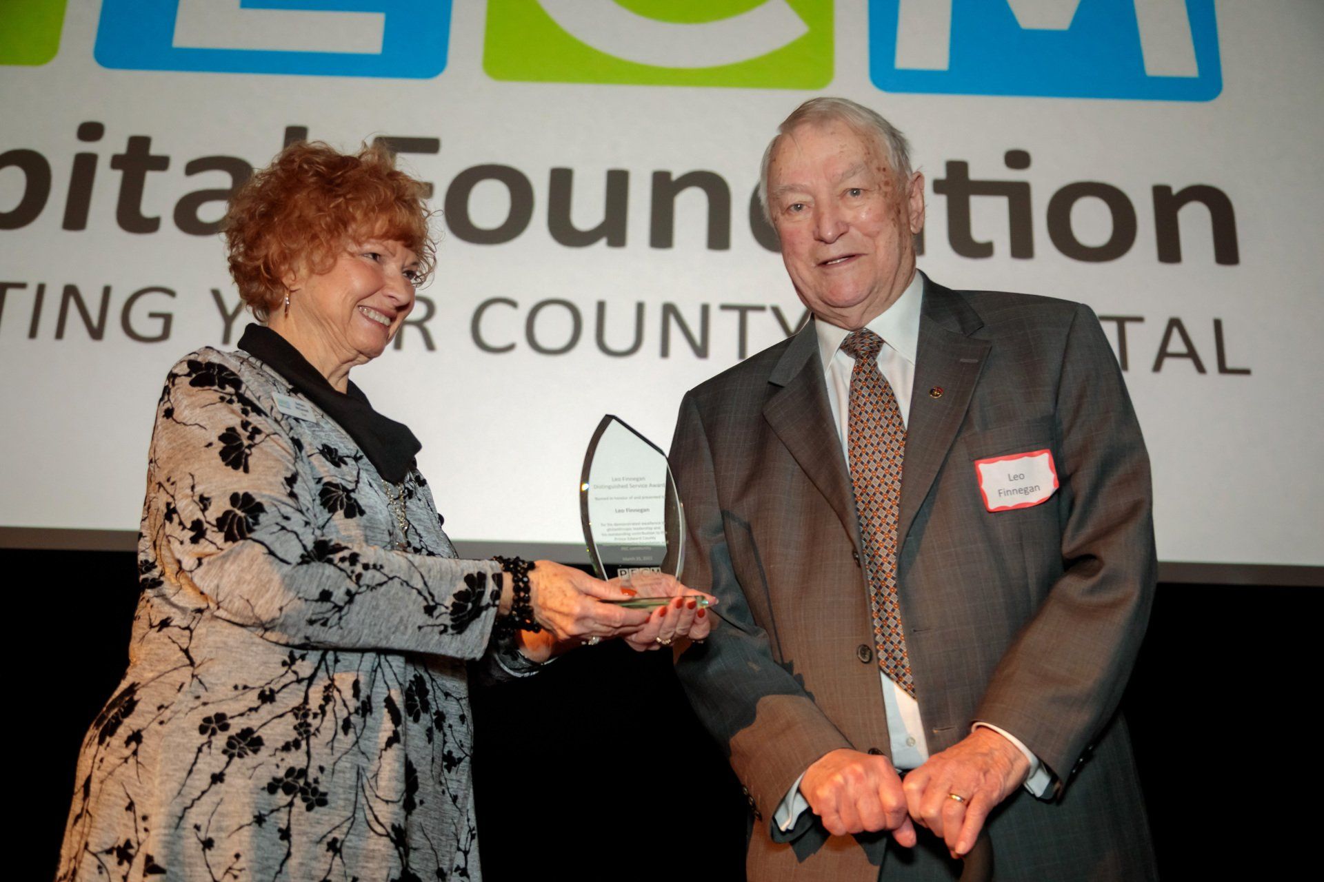 The Leo Finnegan Distinguished Service Award, named for its inaugural recipient, Leo Finnegan, recognizes individuals or organizations who, through their ongoing commitment, outstanding contributions, and service have demonstrated dedication to, and support of, the vision, mission, and strategic imperatives and priorities of the Prince Edward County Memorial Hospital Foundation (PECMHF).