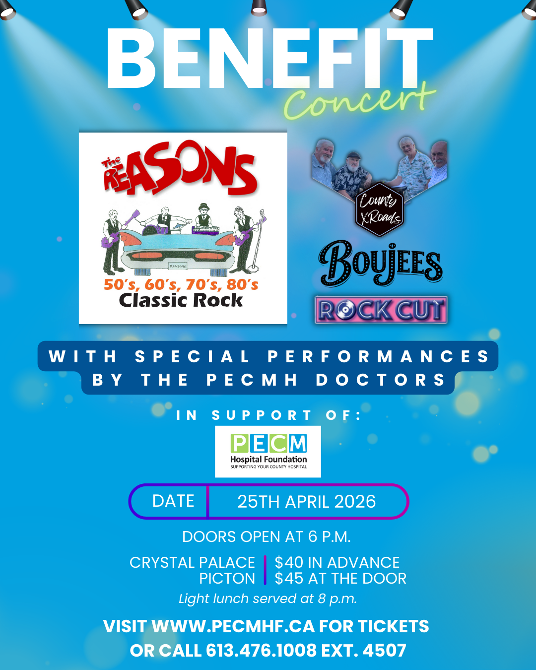 Enjoy classic rock from the 50s through the 80s with live performances by The Reasons, County X Roads, Boujees, and Rock Cut — plus special appearances by the PECMH Doctors.